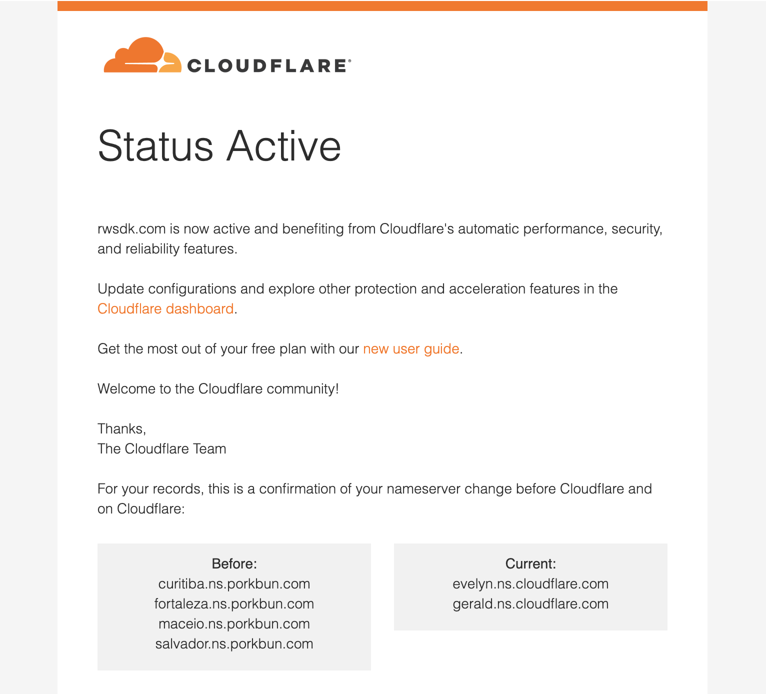 Once Cloudflare has confirmed that your nameservers have been updated, you'll get an email, and your domain will be added to your Cloudflare account.