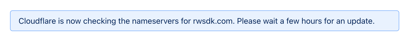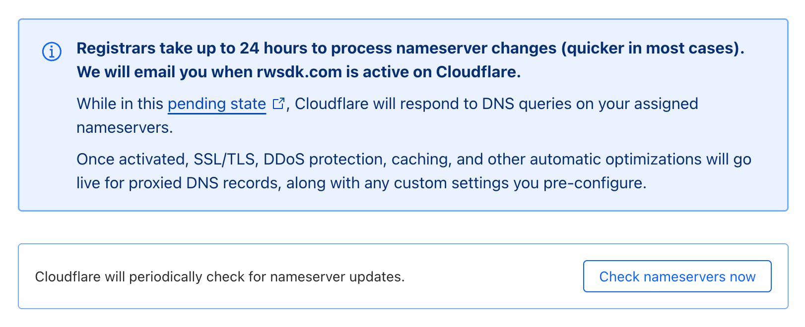 It'll now present you with a note that it can take some time to process nameserver changes. From here, you can just wait until Cloudflare emails you, but for the impatiant amongst us, Cloudflare offers a Check nameservers now button.