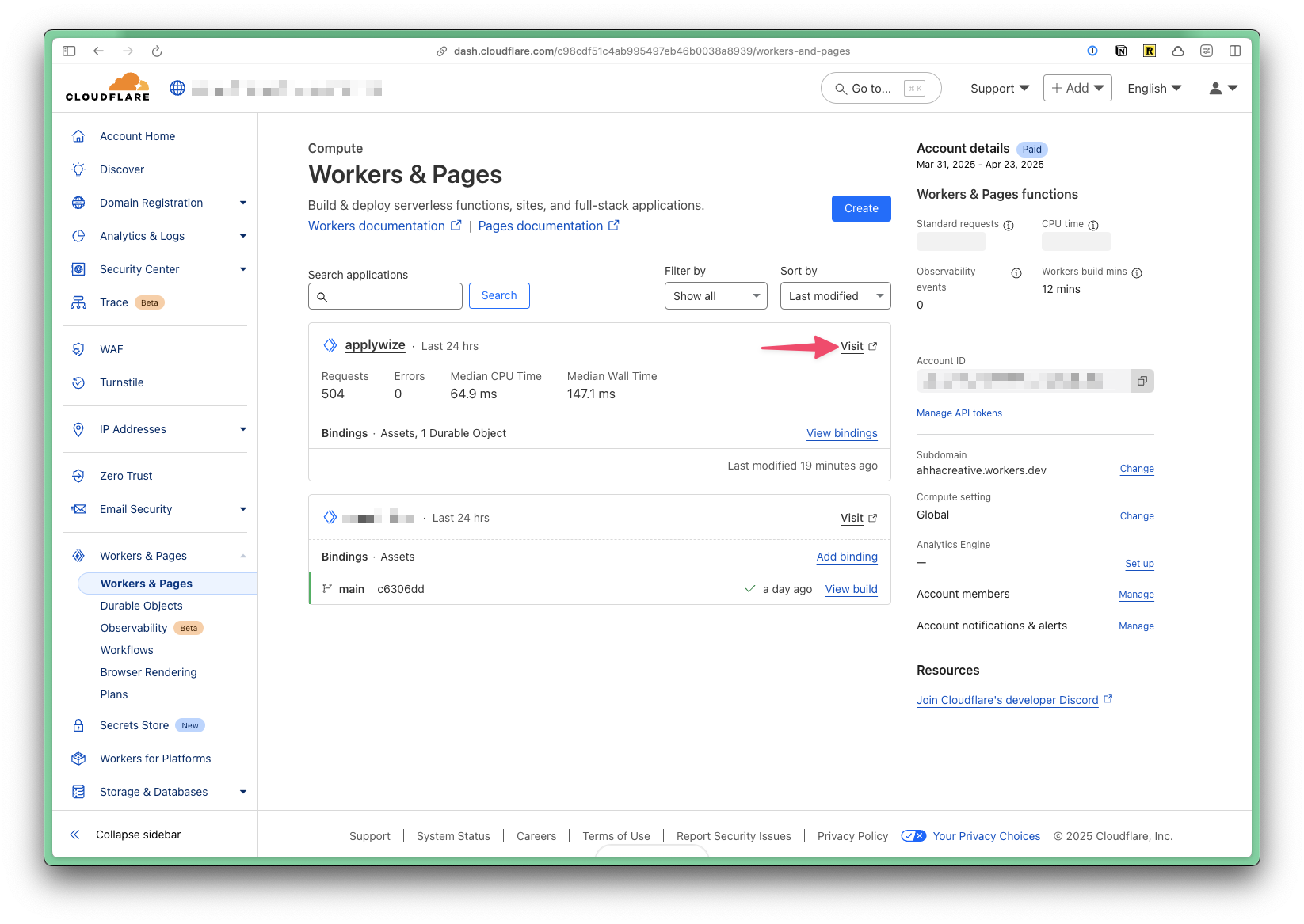 Go to your dashboard in Cloudflare, on the left side navigation click on Workers & Pages. You should see your application in the list. Then, you can click on the Visit link to see your application online.