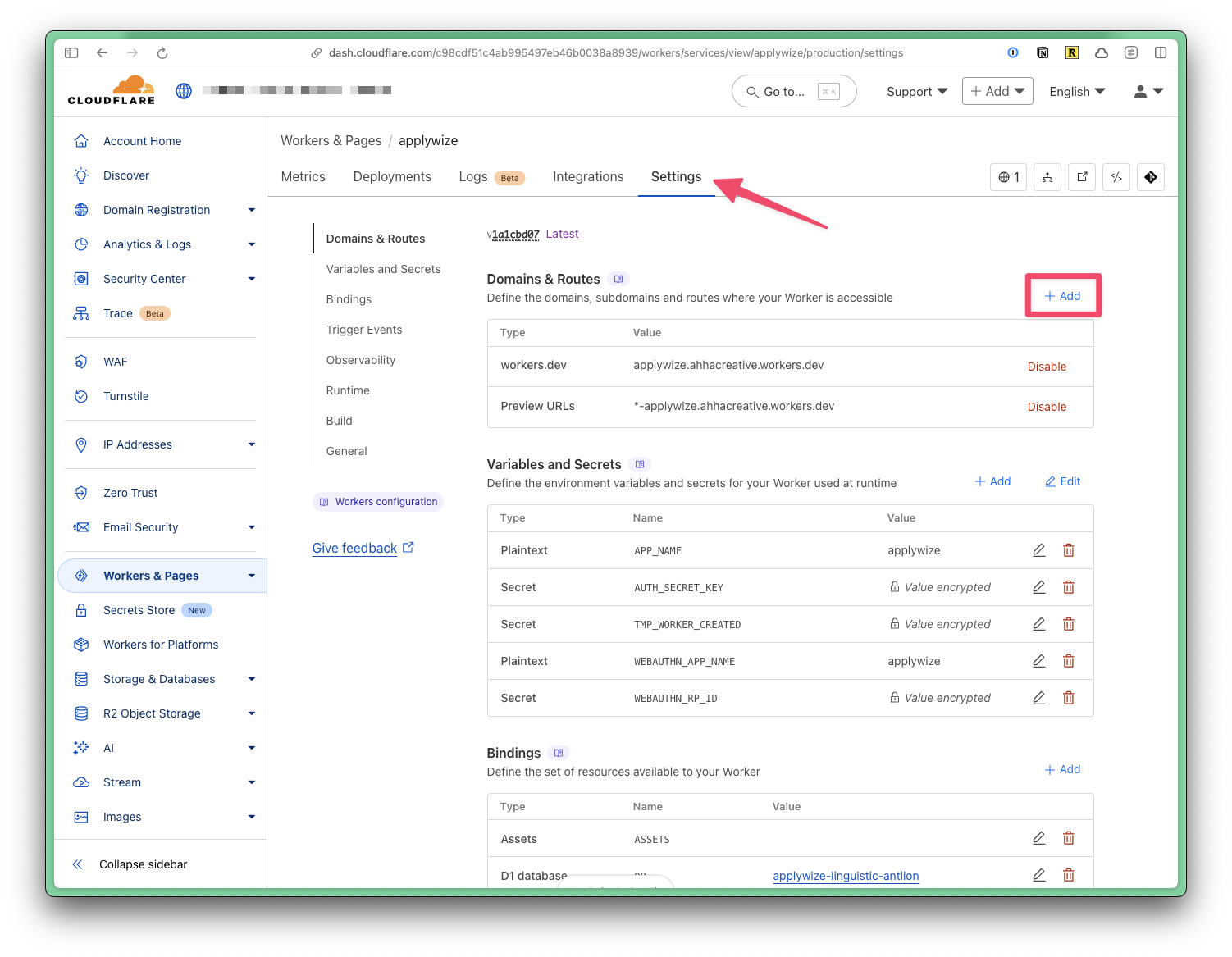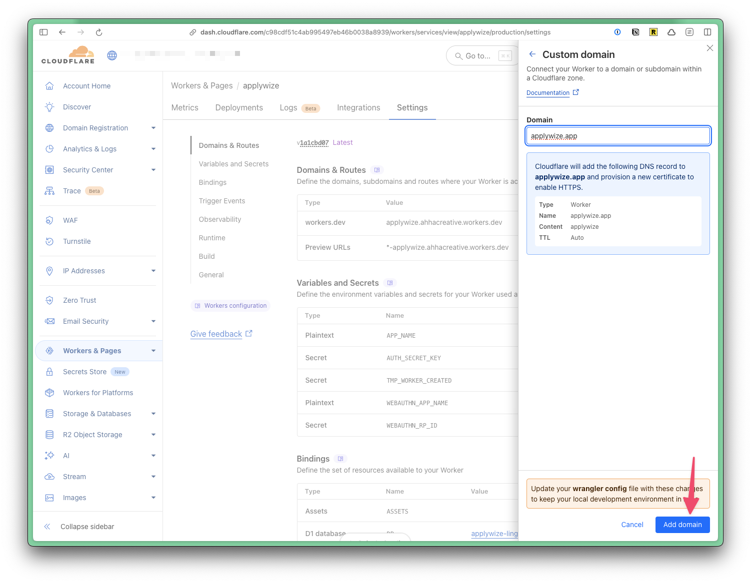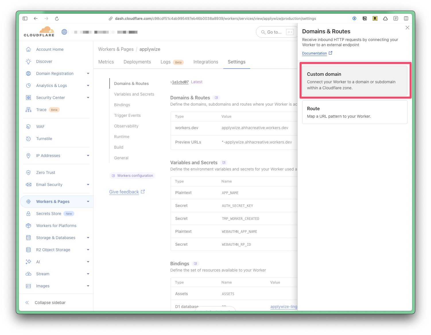 To use a domain name that's registered to your Cloudflare account, go to Workers & Pages in the left side navigation. Then, click on the name of your project. Click on the Settings tab. At the top, you'll see the domains associated with your project.