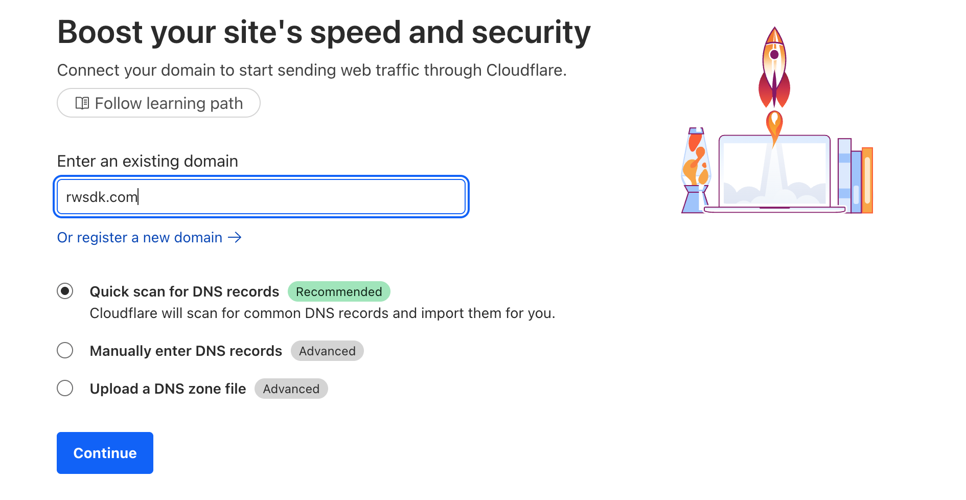 Next, search for the domain name you want to add. You can keep the "Quick scan for DNS records" option checked. Click Continue.