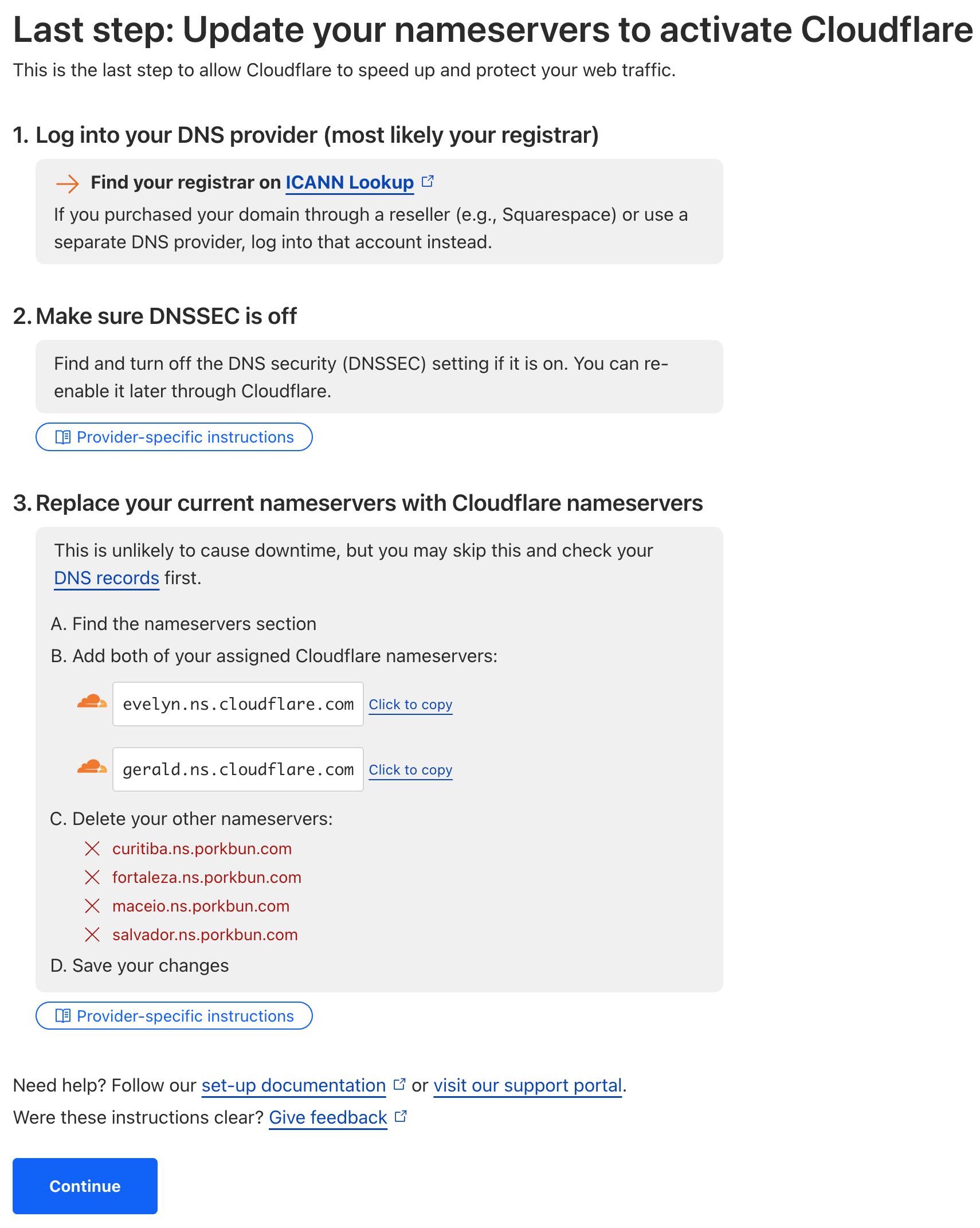 Once you've updated your nameservers, go back to Cloudflare and click Continue.