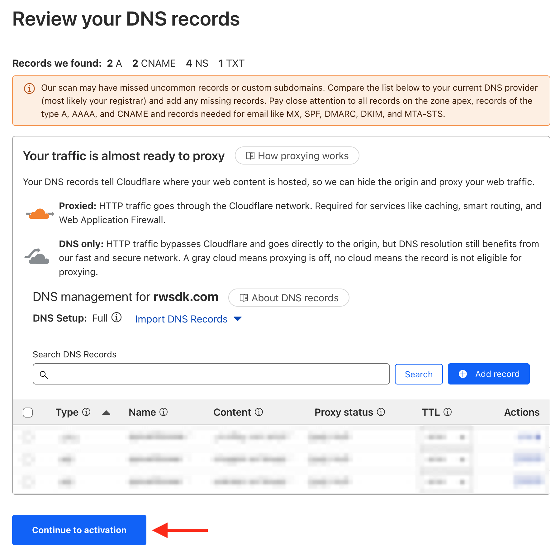 Next, you'll be asked to review the DNS records that Cloudflare found for your domain. If you have any existing DNS records, they will be automatically imported here. You can add or remove any records as needed, and you can always come back to this later.