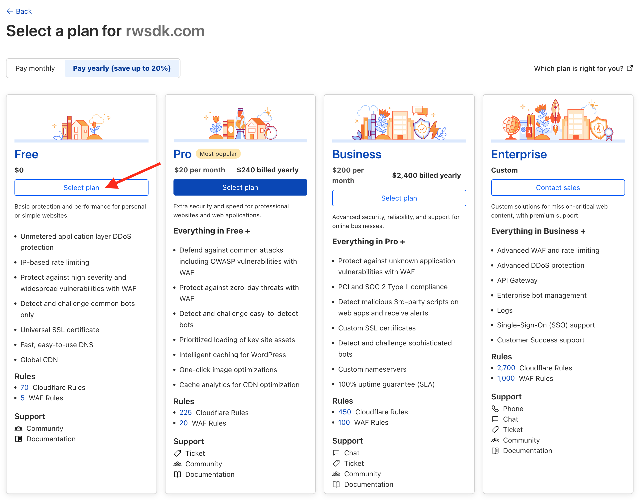 Cloudflare will ask you to select a plan for this domain. You can select the Free plan, which is perfect for most use cases (and you can always upgrade later, if you need). Click Select plan.